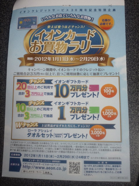 1/11~2/29の間に10回以上イオンカードでお買物していて合計3万円以上のお買物で抽選に応募できます。