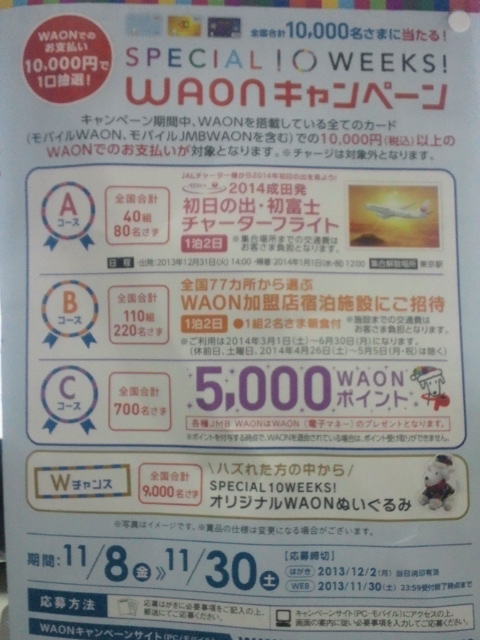 WAONでのお支払い10000円で一口の抽選に参加できます!